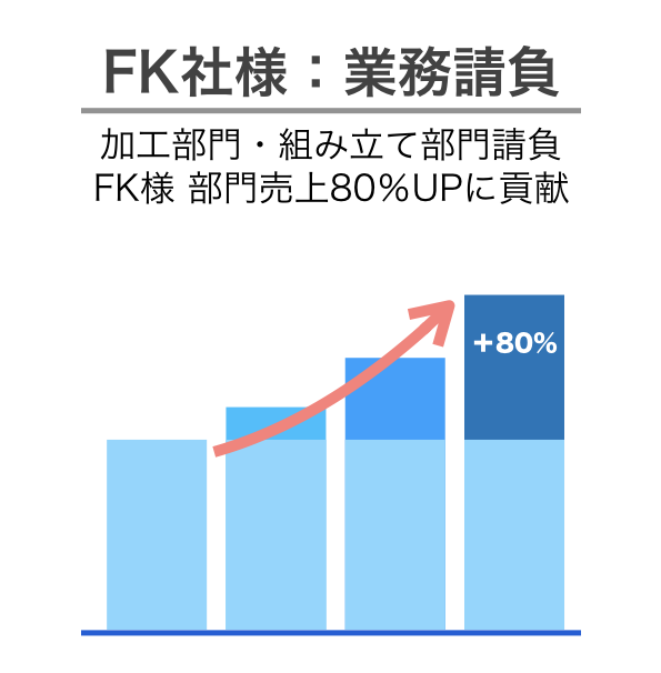 お客様が行う様々な派遣会社との連携から、連携一本化を実現。連携工数、管理工数など、お客様の見えない労務コストをカイゼン。明確な分業化により生産性を向上。生まれた時間をお客様と共に技術者を育成するなどの連携強化に当て、お客様の部門売上80%UPに貢献いたしました。